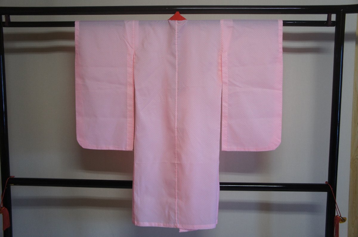 - 化繊女の子3歳長襦袢白色地ピンク色描き疋田模様朱色刺繍半衿付き[C16016]