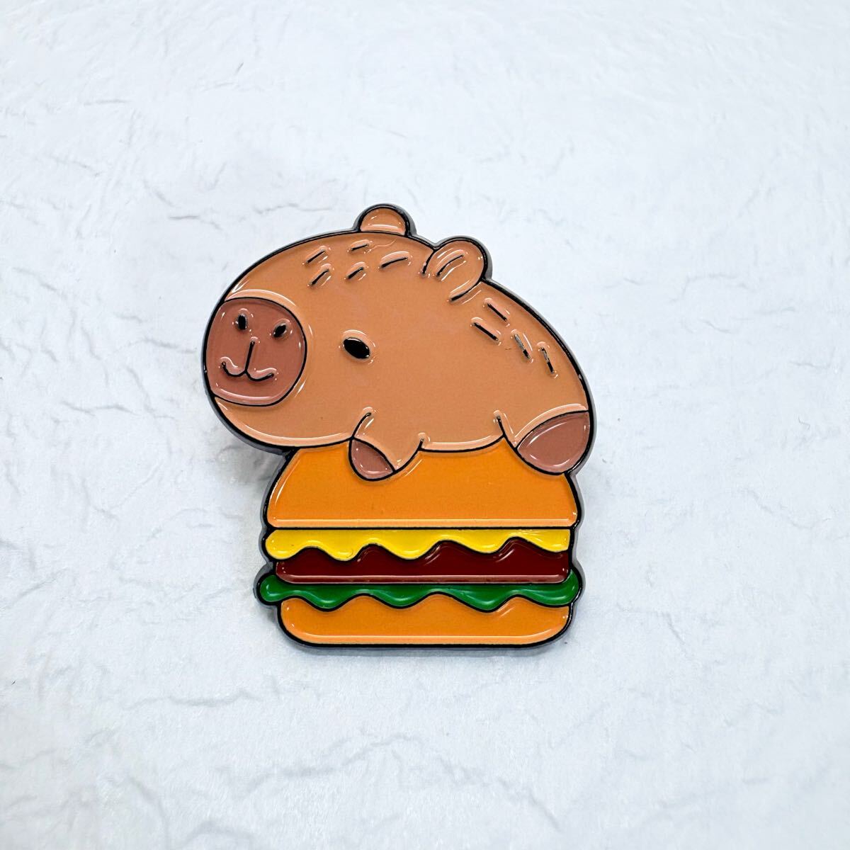 - 【ピンバッジ】カピバラさんとハンバーガー 動物 食べ物 癒し