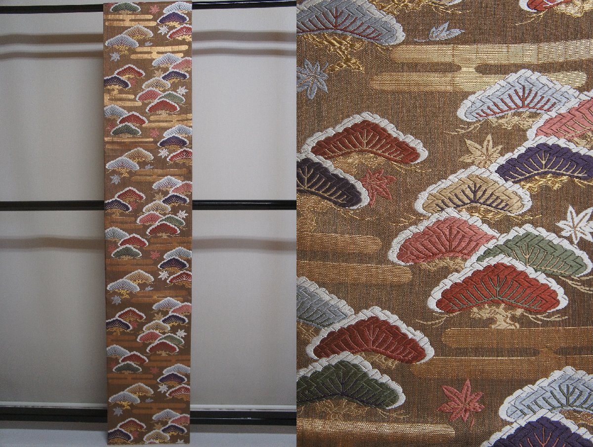 > 正絹唐織茶ねず色金糸地かすみ松楓模様未着用袋帯[O16058]