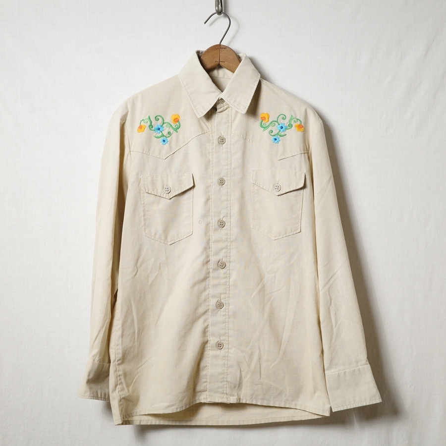 - 70s ヴィンテージ 刺繍 長袖 ウエスタンシャツ ベージュ / コットン 草花 ヒッピー ボックスシルエット