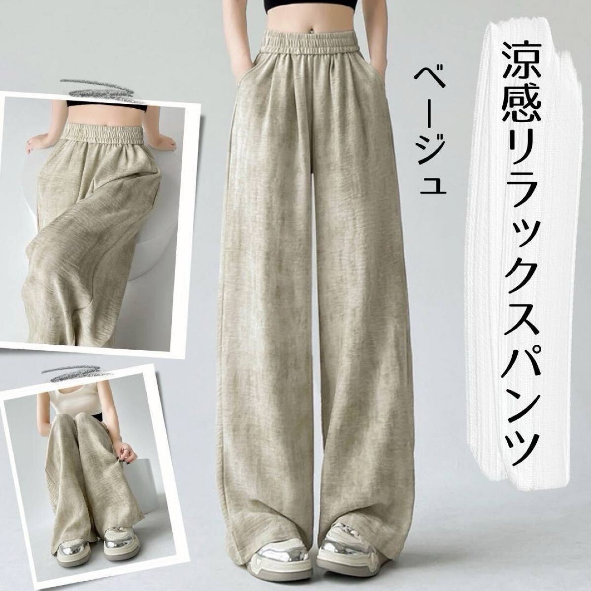 - 涼感 リラックスパンツ ベージュ 接触冷感 スタイルアップ ワイドパンツ