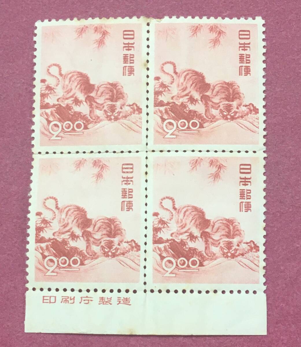 - 銘板付 田型 お年玉年賀切手 昭和25年 応挙の虎 とら 丸山応挙 4連 4枚 2円 未使用品