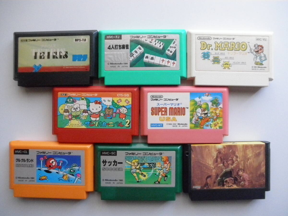 - ●FCソフトセット サンリオCV2、クルクルランド、マリオUSA、グーニーズ、テトリス、Dr.マリオ、サッカー、4人打ち麻雀 初期起動確認済