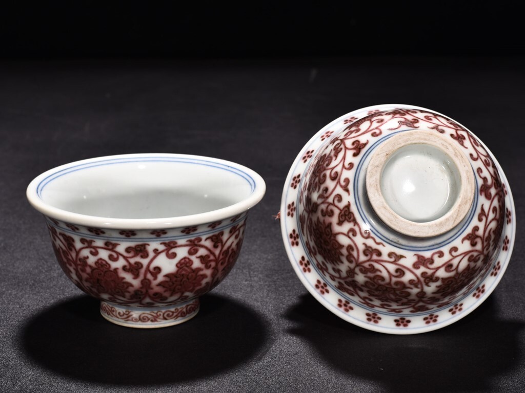 - TA181■中国古玩 唐物 明永楽 青花釉里紅纏枝花卉紋 圧手杯2客 時代物 極上品■
