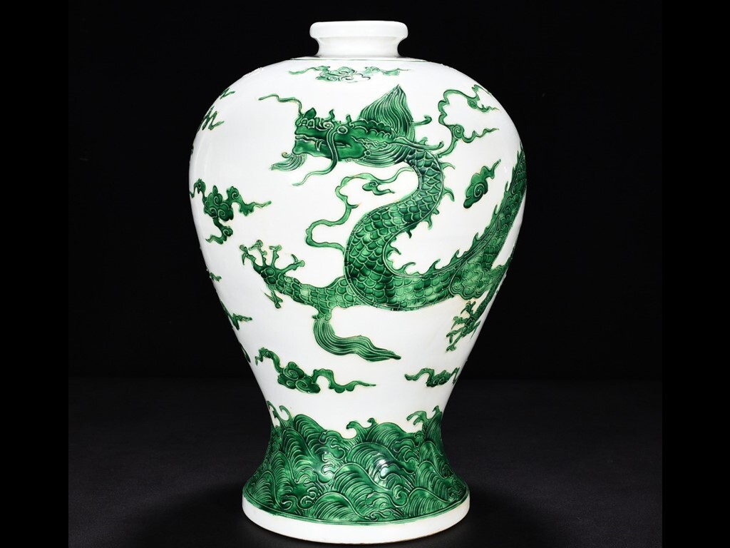 - TA189■中国古玩 唐物 明永楽 甜白釉緑彩堆彫雲龍紋梅瓶 時代物 極上品■
