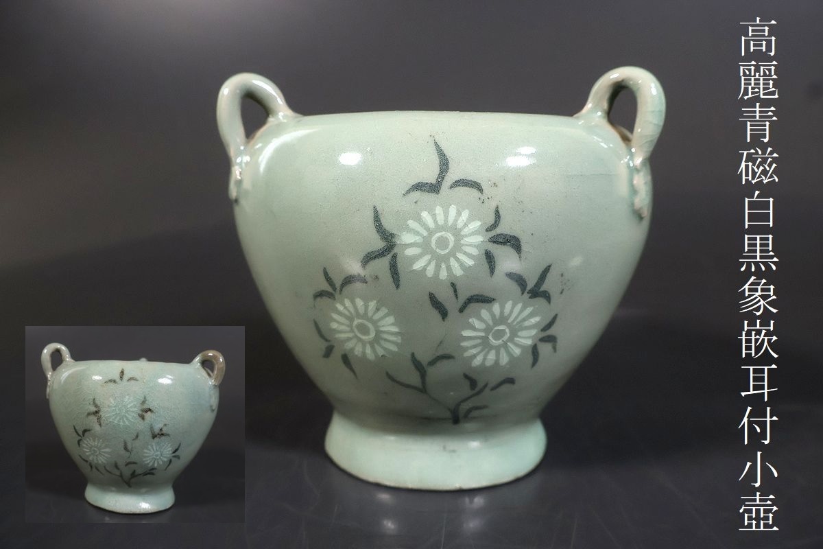 - 【小】5105 朝鮮古美術 高麗青磁 白黒象嵌花文青磁壺 耳付小壺 李朝青磁 保管箱有