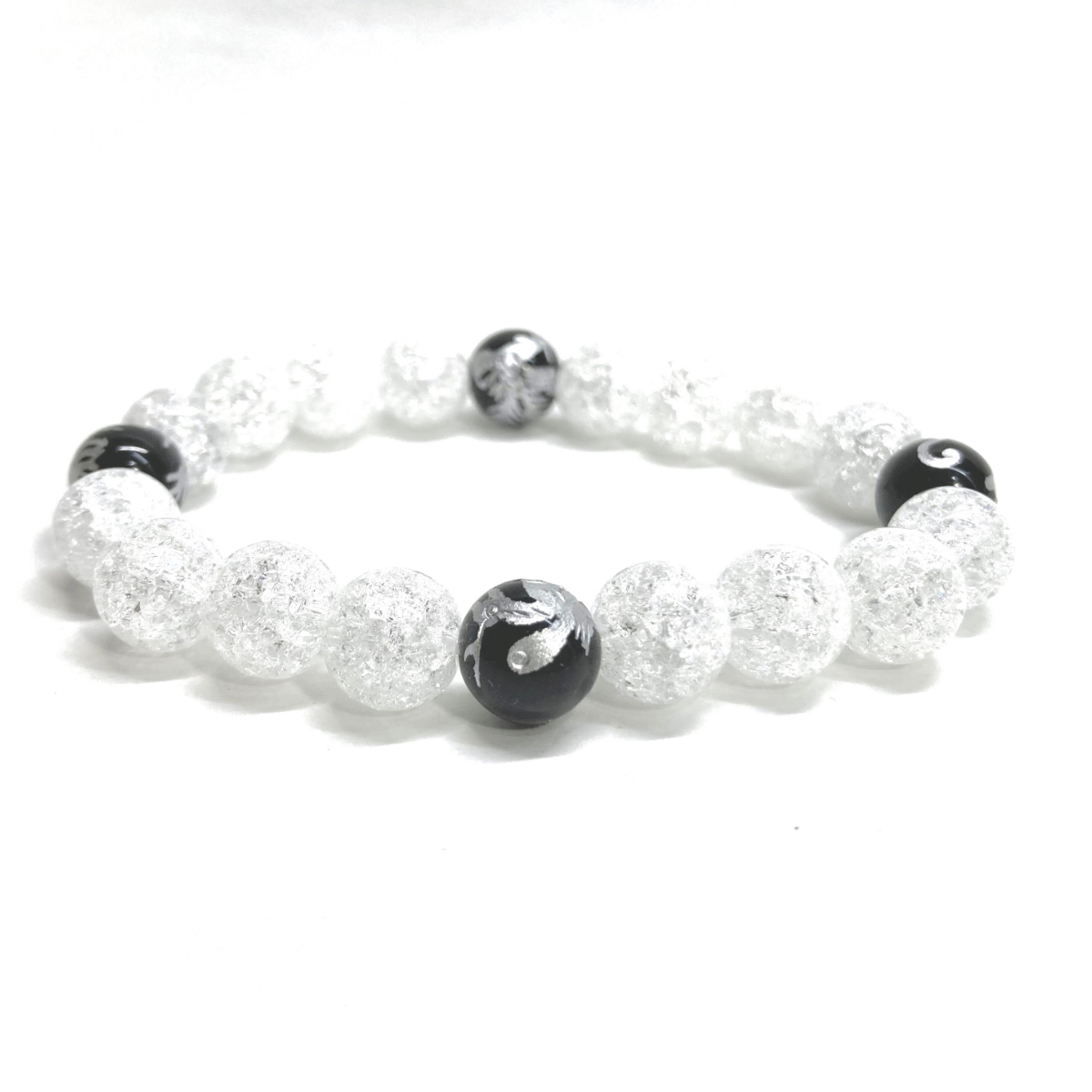 - 10mm 四神獣銀彫オニキス×クラック水晶 パワーストーン ブレスレット天然石 運気上昇 開運 金運 恋愛運 青龍 白虎 玄武 朱雀 ☆