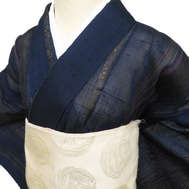 - 夏物 夏着物 小紋 着物 中古 正絹 紗紬 カジュアル 縦段模様 濃紺色 多色 身丈155cm 裄67cm SA きもの北條 A1189-2