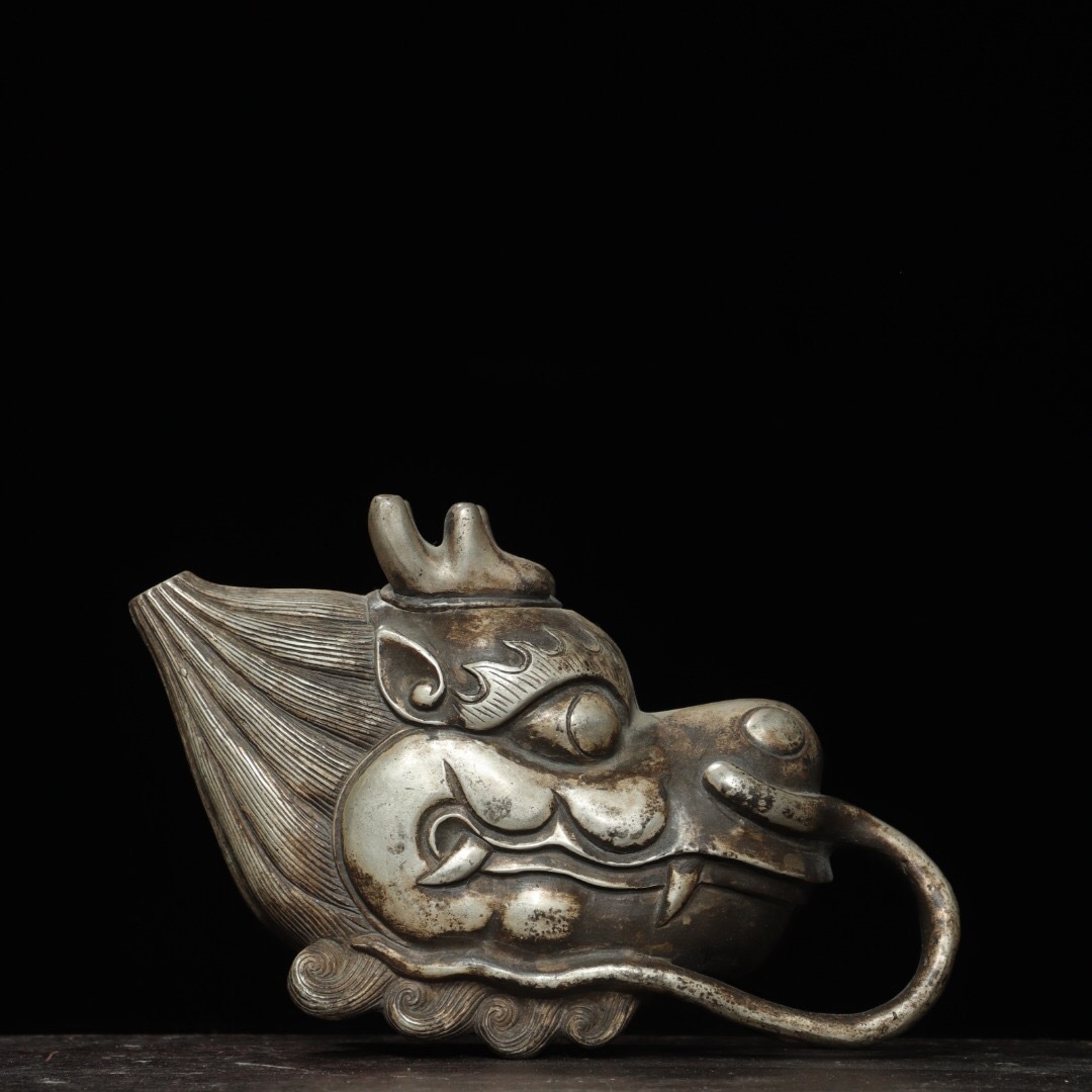 - 蔵友旧蔵出 銅製 銀鍍 龍頭酒壺 置物 古賞物 中国古玩 中国古美術品