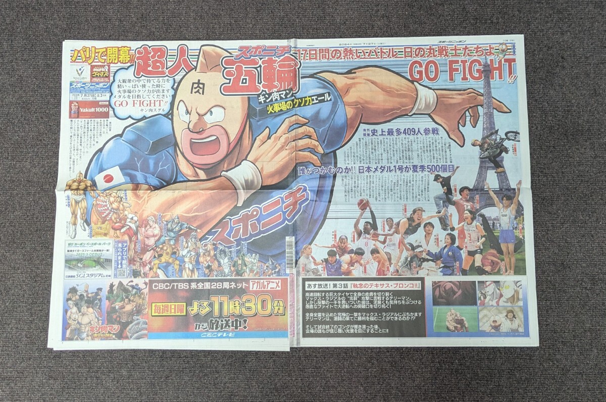 - キン肉マン パリ超人オリンピック開幕 GO FIGHT!! ゆでたまご 新描き下ろし 2024.7/27付 スポーツ新聞記事 スポニチ