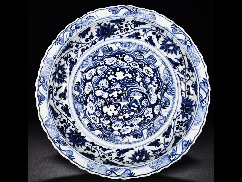 - TA310■中国古玩 唐物 元時代 青花 蓮池鴛鴦紋 葵口折沿盤 款 時代物 極上品■