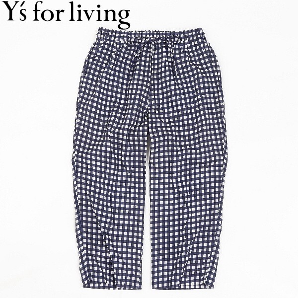 > ◆Y's for living ワイズ フォーリビング チェック柄 シアサッカー コットン イージー パンツ 紺 ネイビー×ホワイト