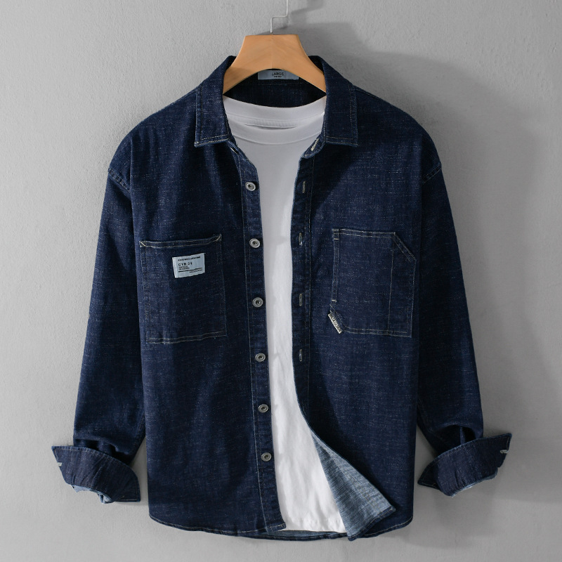 - 人気品L ネイビー デニムジャケットメンズ 長袖 デニム ワークシャツ ウエスタンシャツユーズド加工 インディゴサイズ選択可