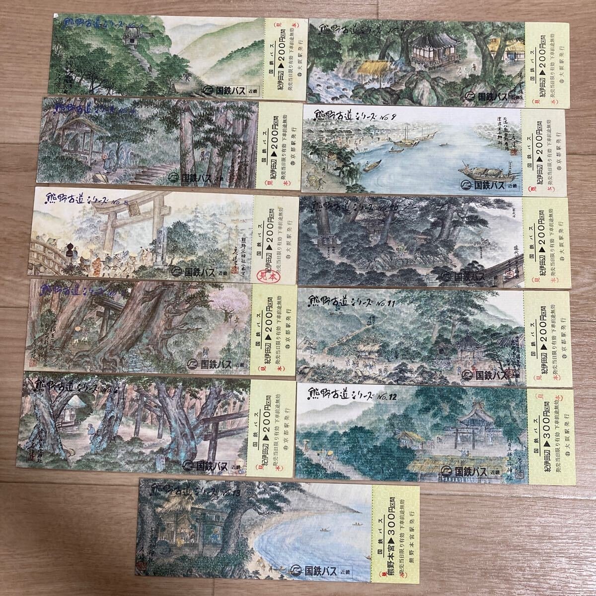 - n5102 国鉄バスの乗車券 熊野古道シリーズ 11枚セット 伊勢田辺→200円 300円 見本品