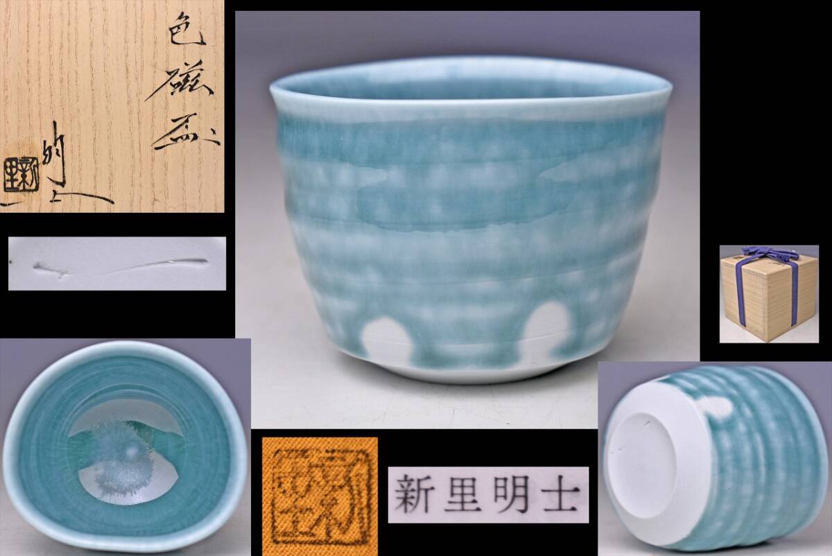 > 新里明士 ★ 色絵 ぐい呑 ★ 共箱 共布 栞 ★ 珍品 ★ 歪みを持たせた造形は手取り良く白磁に美しい釉景の逸品 ★ NIISATO Akio ★ 酒器 杯