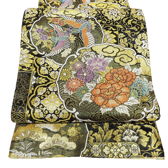 > 袋帯 中古 リサイクル 正絹 六通 花鳥模様 百華紋 松竹梅 七宝 箔糸 ラメ フォーマル 黒 金 きもの北條 T752-10