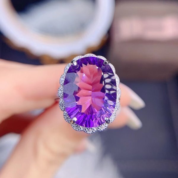 女性のための天然アメジストリング、本物のシルバー、大きいサイズ、シンプルな雰囲気、12x16mm