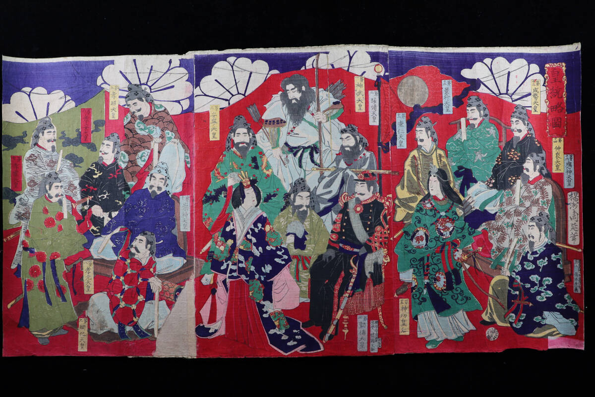 - ◇雅◇ 真作 楊洲周延 「皇統略図」 明治 江戸 時代物 木版画 浮世絵 錦絵 武者絵 3枚続揃い /FT.25.4 [I74.10] TR12