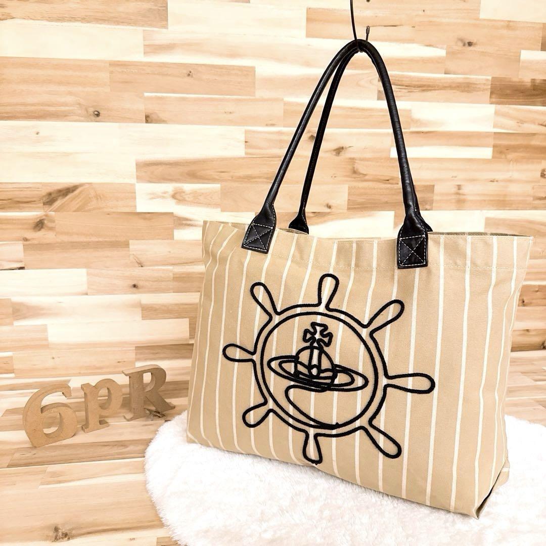 程良いハリ感がありつつも柔らかく、毎日に馴染む使い心地のベージュのキャンバス地に涼しげなホワイトのストライプが走る、自然な優しさと落ち着きが漂うルックス。フロントにロープで施された立体的な「オーブ」がブラックの持ち手と響き合い、全体を引き締めるアクセントになり、ナチュラルカラーを活かした軽やかなコーディネートにぴったりな、とってもオシャレなVivienne Westwoodのトートバッグです。