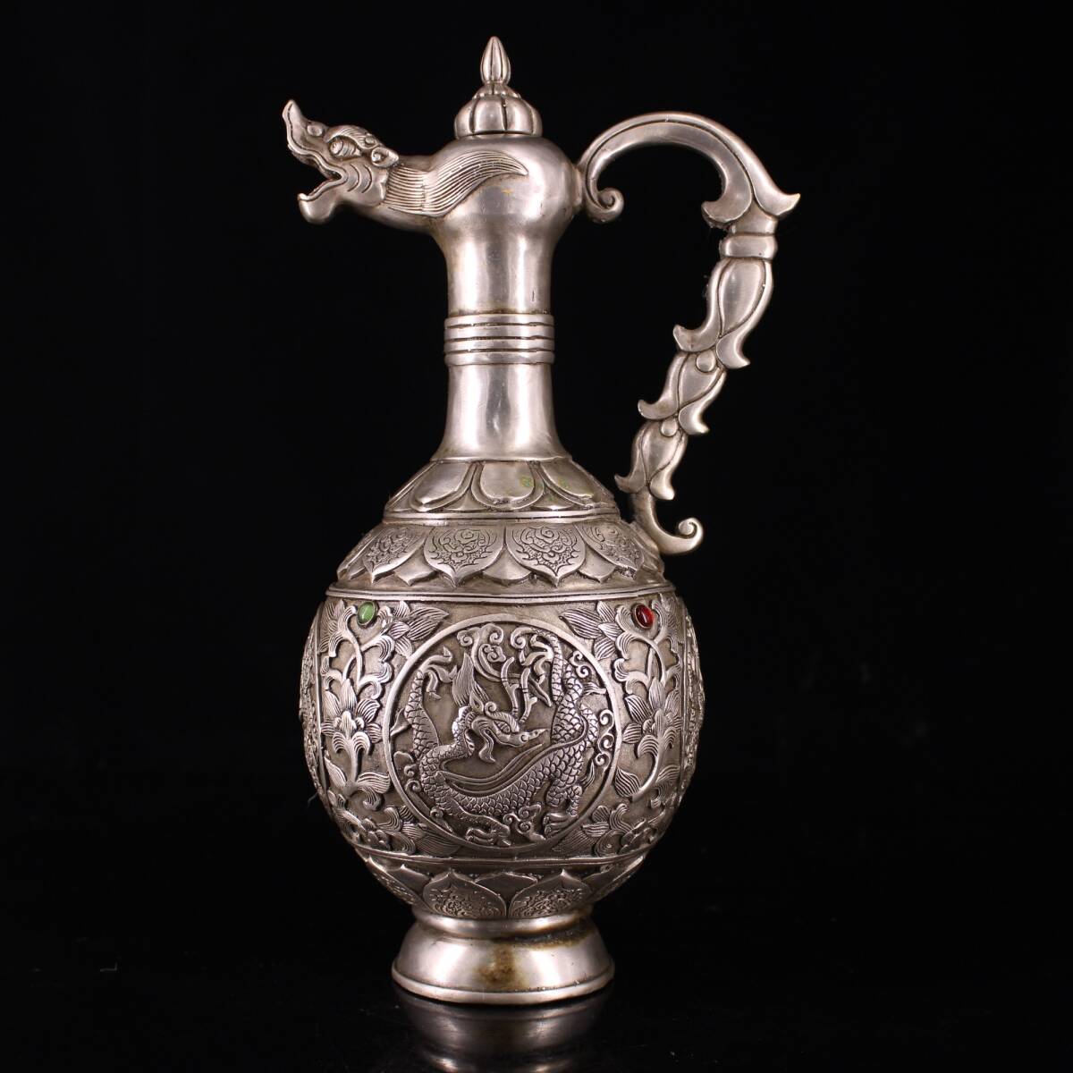 - 【超珍館蔵】銅製 銀鍍 寶石嵌 龍紋酒壺 置物 賞物 古賞物 古美術品 稀少珍蔵品