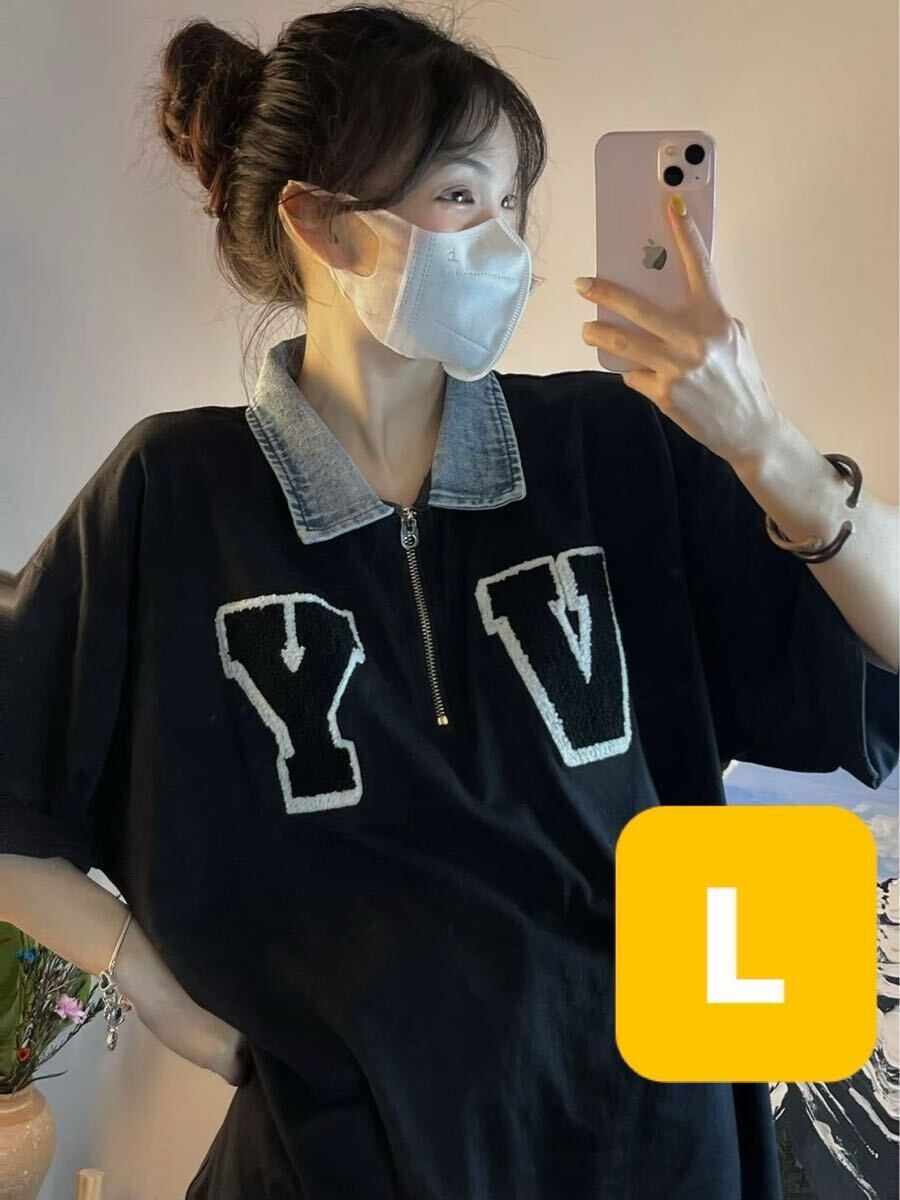 - ポロシャツ ビッグシルエット 半袖 トップス カットソー ジップ シャツ レディース メンズ 襟付き デニム生地 ユニセックス トレンド L