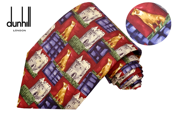 - N-2900★送料無料★超美品★dunhill ダンヒル★レトロ イタリア製ヴィンテージ レッドベース パターン 犬 ヨーロッパ 城 絹 シルクネクタイ