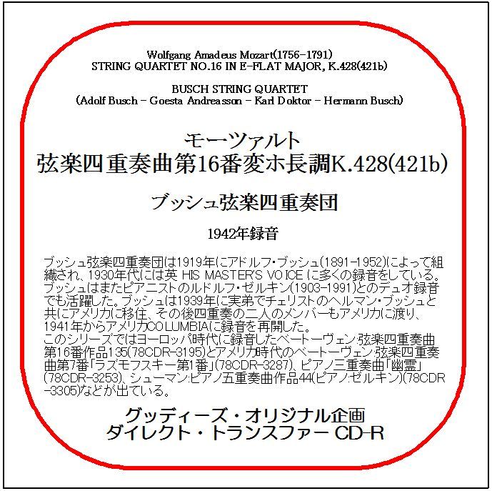 - モーツァルト:弦楽四重奏曲第16番/ブッシュ弦楽四重奏団/送料無料/ダイレクト・トランスファー CD-R