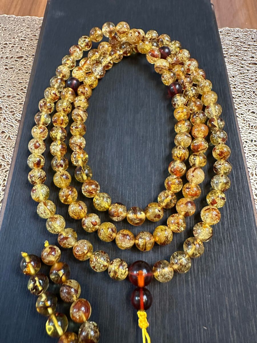 - T-731 天然 アンバー 本琥珀 花アンバー ネックレス兼ブレスレット108粒