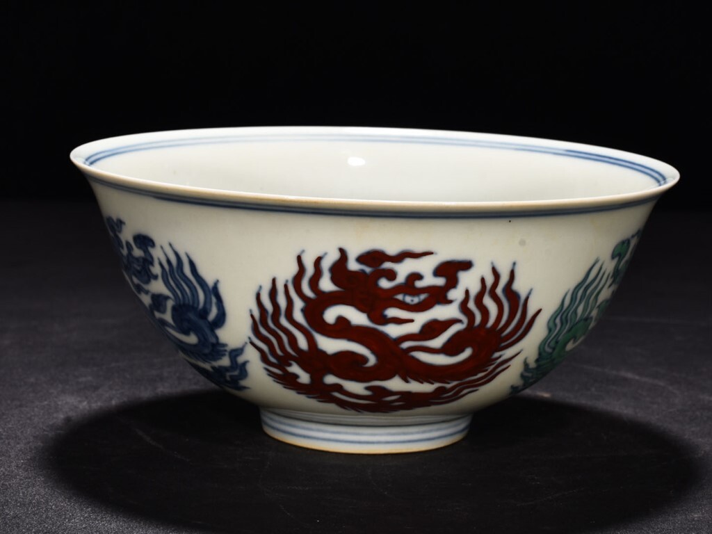 > TB109■中国古玩 唐物 明成化 闘彩の団鳳凰紋宮式碗 時代物 極上品■ 高さ7.5cm・直径15cm■