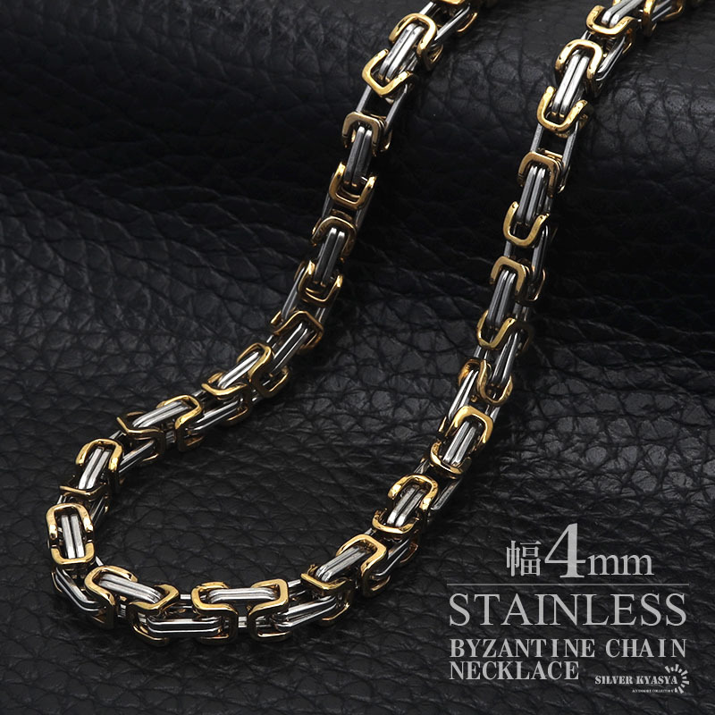 - (55cm) ステンレス ごつめチェーン ネックレス 幅4mmネックレス ビザンチンチェーン スクエア ごつい ゴールド シルバー