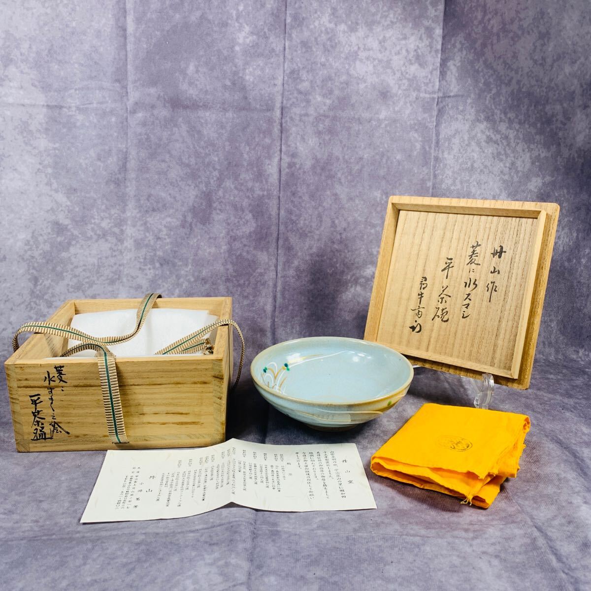 > 小峠葛芳(丹山) 造/菱に水すまし平茶碗/久田宗他(尋牛斎)書付 茶道具 丹山窯 茶碗 茶道具 書附 共布