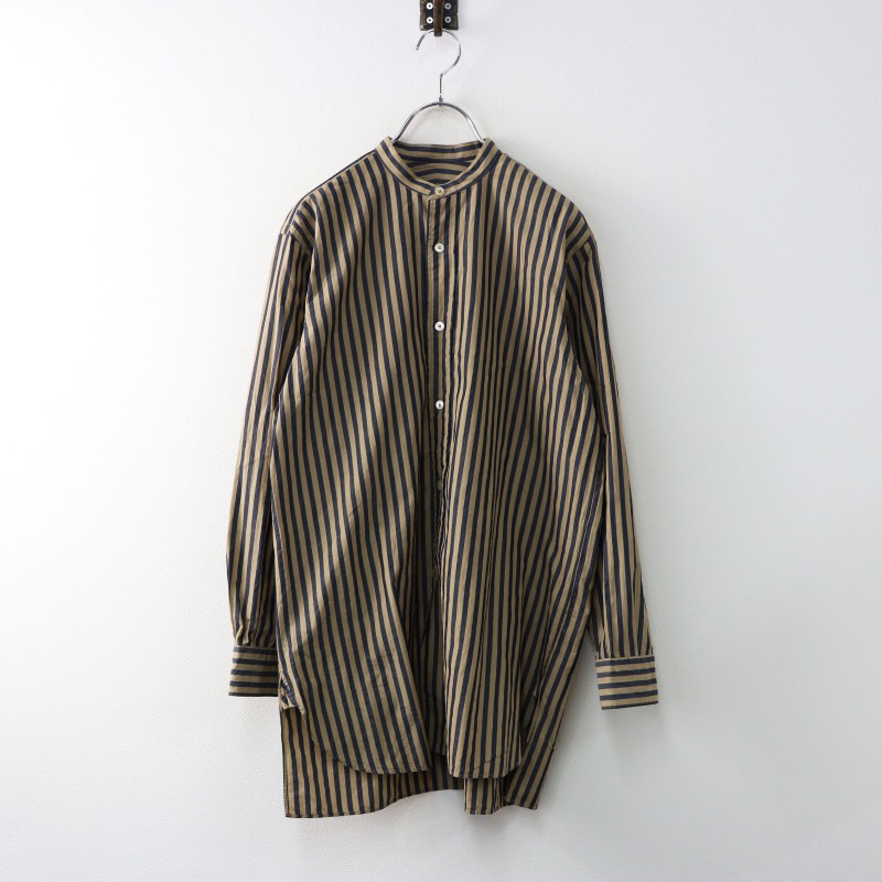 > 美品 コモリ COMOLI ロンドンストライプバンドカラーシャツ/ベージュ ネイビー コットン 長袖【2400014438161】