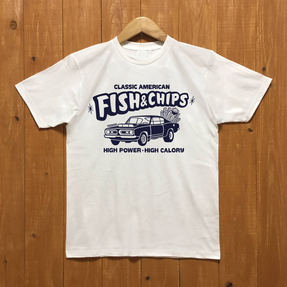 - ■ FISH & CHIPS Tシャツ■XLサイズ(ホワイトxネイビー)アメリカ アメ車 モパ- MOPAR PLYMOUTH BARRACUDA ハンバーガー