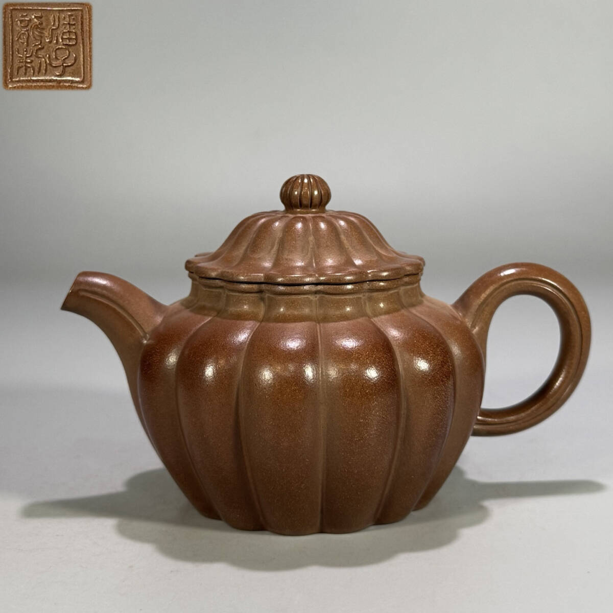 - 古陶芸 紫砂壷 清時代 【潘子龍】 製 「頸紋タツ球壺」 段泥 煎茶 急須 茶道具 唐物 時代物 茶器 容量260cc LT-2505112