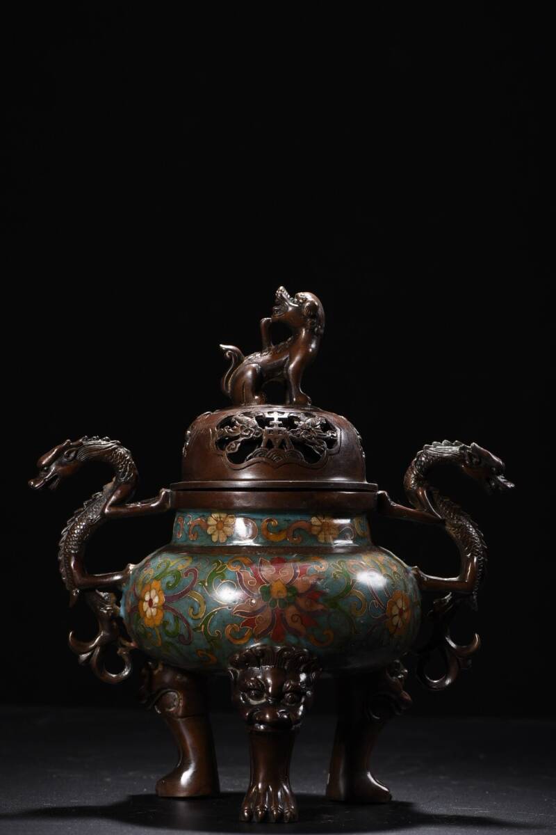 - 蔵友旧蔵出 銅製 景泰藍 琺瑯彩 纏枝蓮紋 三獣足雙龍耳 獣鈕熏香爐 貴重品 置物 古賞物 密宗密教 供養品 仏教美術品