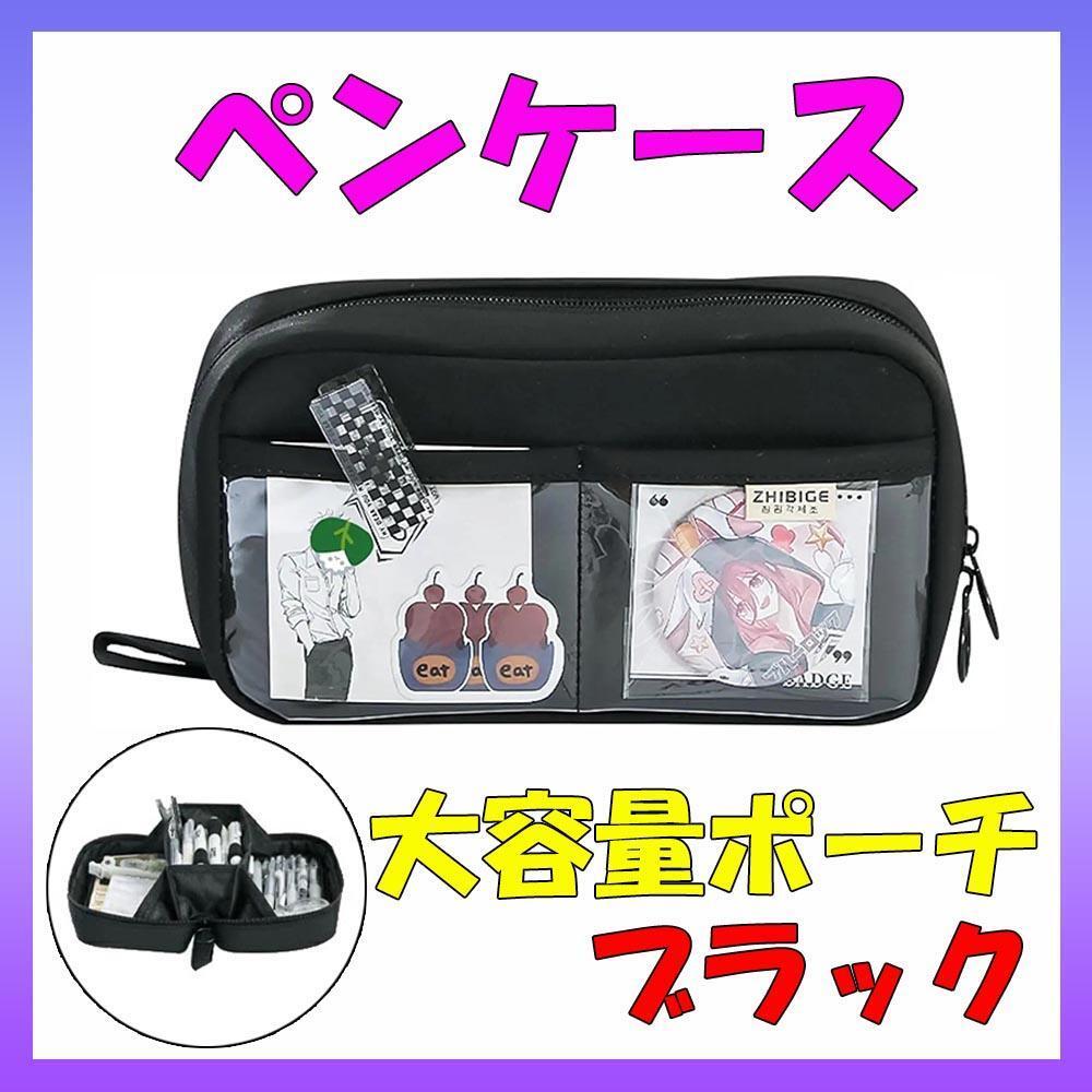 - ペンケース ポーチ クリア ポケット 推し括 筆箱 大容量 大開口 ブラック 黒