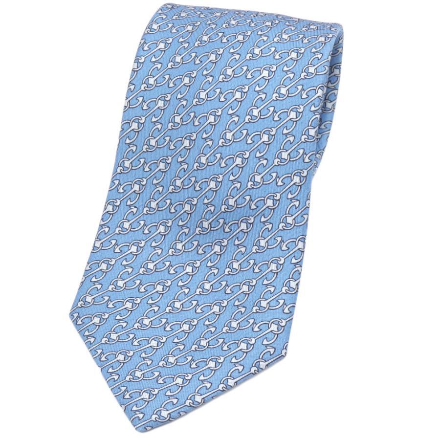 - 美品 エルメス ブランド ネクタイ HERMES 高級 シルク 100% レギュラータイ プリント イカリ 錨 碇 ブルー 青 水色 メンズ OJ10536
