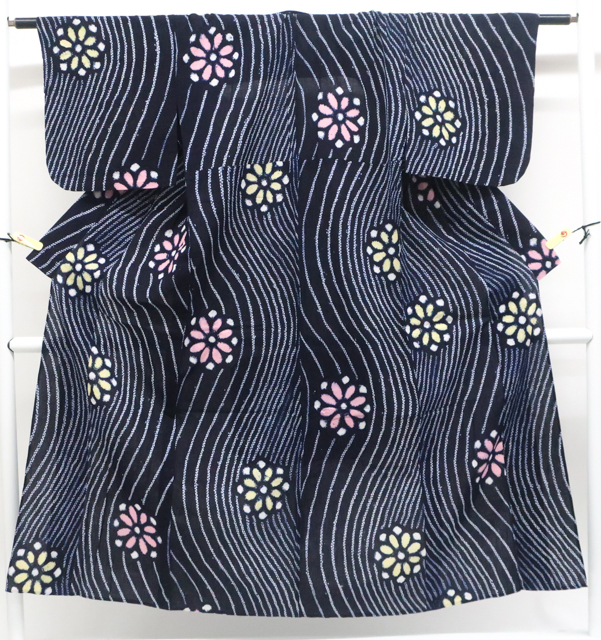 - 《京都一輝堂》【着物】 浴衣 昭和レトロ 有松絞り 曲線に花柄 身丈約150.5cm 裄丈約62.5cm r7z05-504