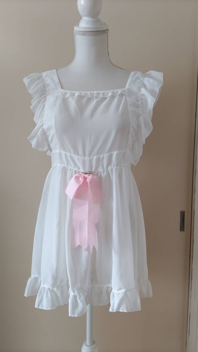 - No.2704_海外ロリィタ_白シフォンピンクリボンフリルエプロン