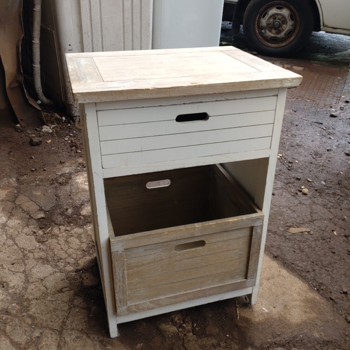 - 【店頭渡し推奨】 カントリー風 作業台 収納 木製 家具 花台 工具箱に 中古 現状渡し