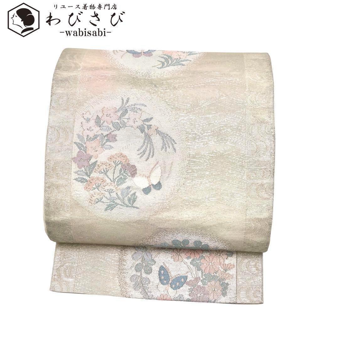 > 夏帯 袋帯 紗 丸に蝶々と華柄 銀糸 乳白色 O-3569 着物 きもの kimono 和服 和装 中古 リサイクル着物 【送料無料】