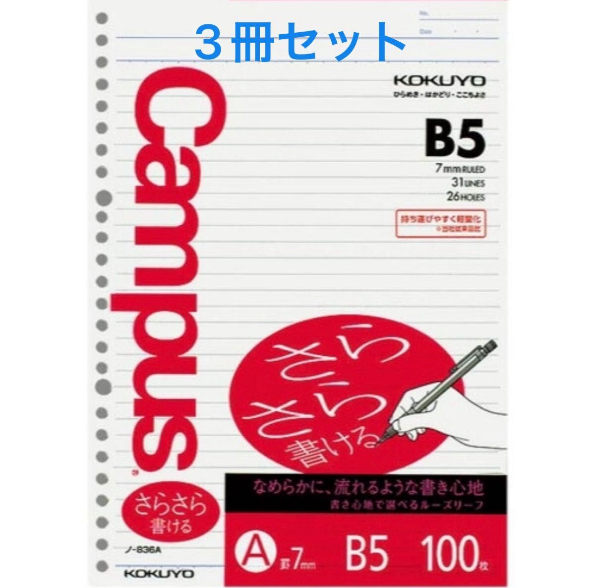 - 【新品・未開封】コクヨ キャンパスルーズリーフB5 26穴A罫100枚×3冊セット
