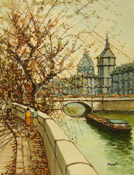 - ヨーロッパ絵画 肉筆油絵 (額縁付きで納品対応可) サイズF6号 ニカル作 「パリの街角」