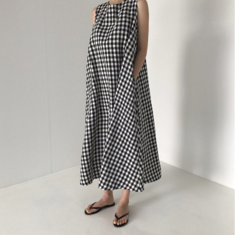 - 新品夏 可愛い カジュアル 綿麻リネン チェック柄 ノースリーブ コットン ゆったり Aライン ロングワンピースサイズ選択可