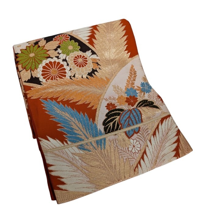 - 帯 袋帯 和装用 和服用 着物用 鮮やか 艶やか 刺繍 花柄 菊 草木 朱色 赤系 ゴールド レディース 【中古】