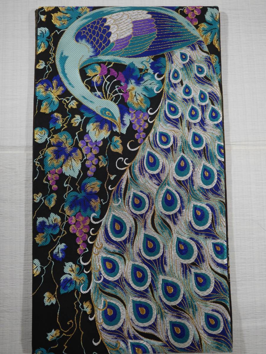 - 未仕立て新品 西陣織最高級袋帯 孔雀ティファニーの世界 黒地 六通総柄 お仕立て代込み 送料無料