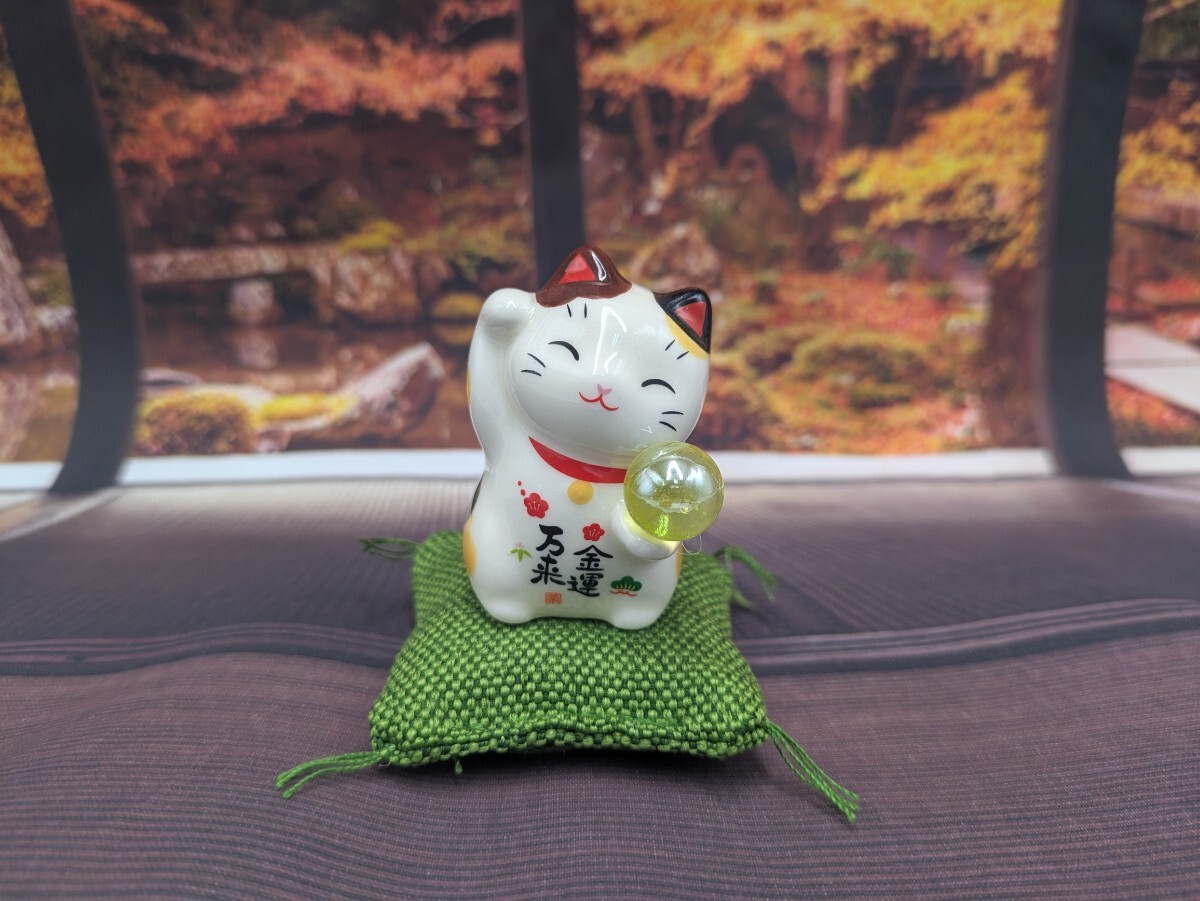 - 縁起物 招き猫 彩絵玉もち招き猫 金運万来 座布団付き 薬師窯 しあわせこいこいやってこい