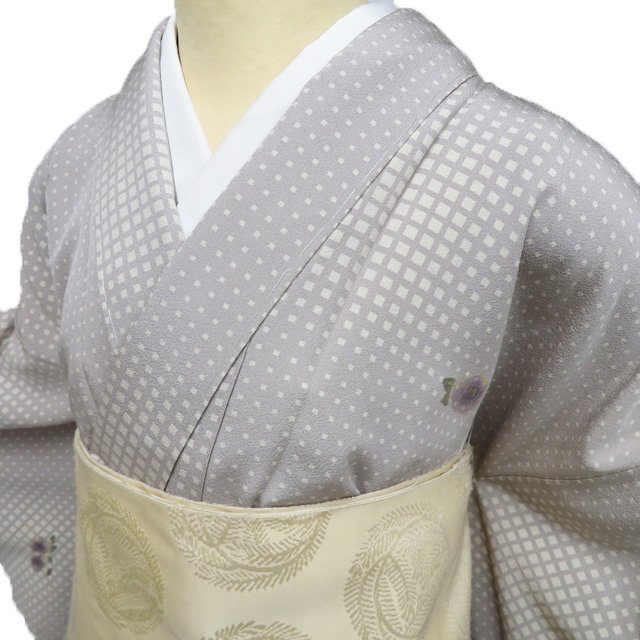 > 特選 小紋 着物 中古 正絹 空海子 落款 薔薇模様 反端付き ライトグレー ベージュ 金 身丈164.5cm 裄70cm L ワイド きもの北條 A1204-7
