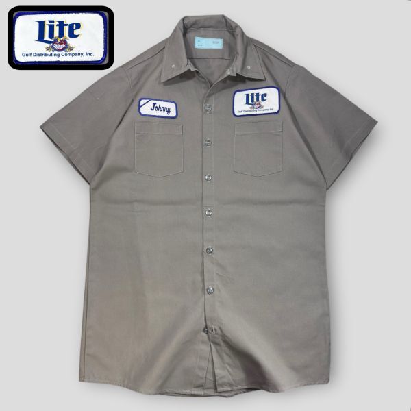 > ★Miller Lite Beerロゴ★半袖ワークシャツ sizeM グレー系 ロング丈 中厚地 古着 クリーニング プレス済み 2229