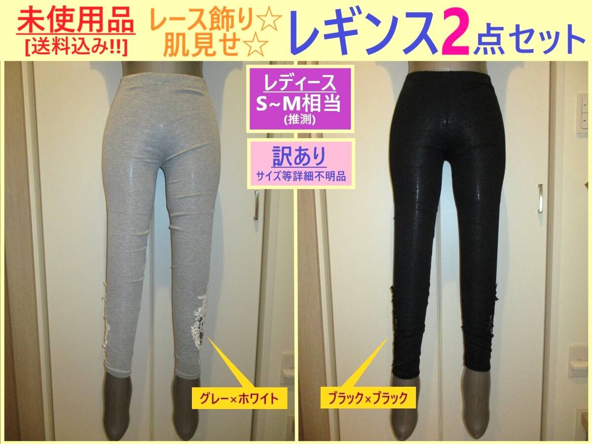 - 訳あり 未使用 レディース 肌 見せ レース 飾り レギンス 2点セット D 黒 灰 白 詳細不明 S~M相当? ロング ウエスト ゴム スパッツ 海外製